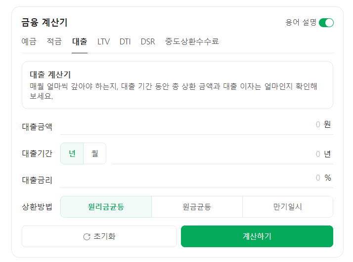 간단한 방법으로 대출금, 금리, 상환기간 정도만 입력하면 간편하게 모의 계산이 가능합니다.